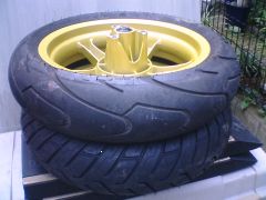フロントフォークの交換&ビックローター化に先駆けてスリップサインが出てしまったリアタイヤを交換。さらに、ホイルを外したついでに、ゴールドに塗装しちゃいました。