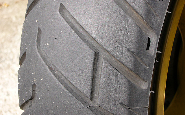 リアのGOLD STANDARDは,まだ溝は十分残っているのですが,雨の日はグリップしないし,晴れてても時折ズリズリっと滑るようになってきたので,前後同時に交換しちゃうことにしました。リアタイヤはスタンドが擦る角度で端っこが,まんま残っちゃいます。