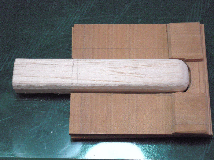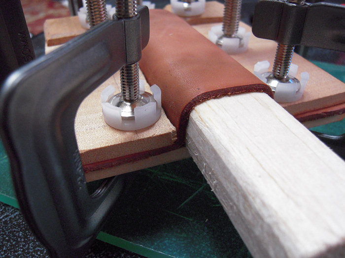 雄型は,加工が簡単なバルサ材を使用しました。これに,底板と革の厚み分だけ大きめに切り抜いた板の枠を組み合わせて,たっぷり水を吸わせて柔らかくなった革を少しずつ枠で押し付けながらクランプでガッチリ固定して,このまま数時間乾燥。