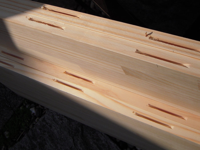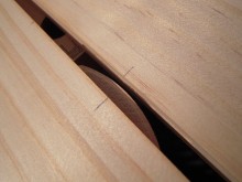 繋ぎ合わせる部材に,ビスケットジョイナーで楕円状の溝を掘ったら,おがくずを固めたようなビスケットと呼ばれる板を差し込んで木工用ボンドで接着する仕組みです。こんなのダボで出来るぢゃんと思うかもしれませんが,穴あけの正確性が求められるダボと違い,上下方向はジョイナーのガイドでばっりち,左右方向では溝に余裕があるのであとから微調整も可能だったりします。またチドリ状に高さを変えて繋ぐ箇所を増やせば強度もバッチリ。