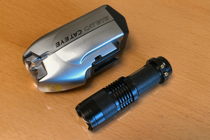 今まで使用していたヘッドライトは,CAT-EYE の HL-500II.単三電池4本のマイクロハロゲン(4.8V-0.5A 2.4W) でそこそこ明るいのですが,電池の持ちが悪いので,予備電池は必須.新しいほうは,単三1本で使える LED の懐中電灯.3W クラスのハイパワーLED なので,小型ながら明るさも十分.こいつを,DOPPELGANGER ヘッドライトブラケット DLST01 を使って,ヘッドランプとして使用します.