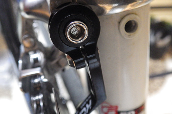 ベースのパーツをFDの固定ボルトと入れ替える形で取り付けたら,チェーンキャッチャー部分を調整.