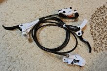 ブレーキには,Shimano BR-M395/BL-M396 のセットを選択. 箱無しバルク品で,左:フロント・右:リアの EUで一般的?な仕様の組付け.どうせ,ホースの長さを調整するのに一度外すので,どっちが前でもOK