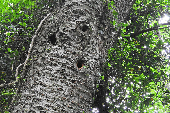 キツツキの仲間(コゲラでしょうか?)があけた穴,ササのトンネル