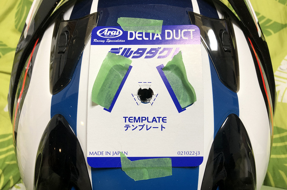 ヘルメットの内側から鉛筆や割り箸で突くようにしてドレンホールの蓋を外して、ダクトを張り付ける部分をきれいに脱脂して取り付けの準備は完了