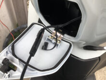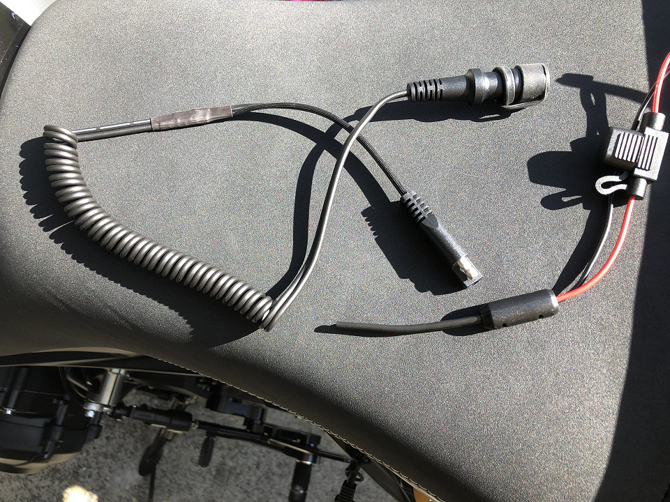 これで、車両とケーブルを簡単に脱着できるようになったので、バイクから下りた際にいちいちシートを外して中にしまう必要もなく、LEAD125 でも充電用の端子に繋いで電源を確保できるようになりました。