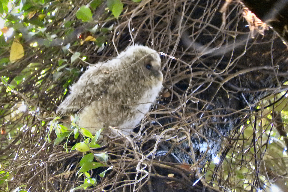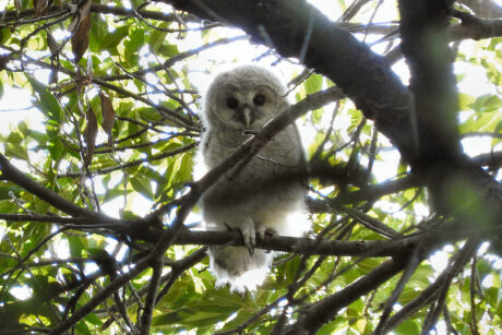 あたりを探すとフクロウの雛が3羽ほど、木の枝を行ったり来たり。 近くに親鳥(メス)もいてこちらを警戒しているようでした。