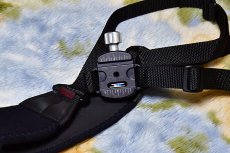 望遠レンズを付けたカメラを首からぶら下げるとバランスが悪く双眼鏡との相性も悪いことから、レンズやカメラの三脚座を利用して装着する襷掛けのストラップを導入しました。