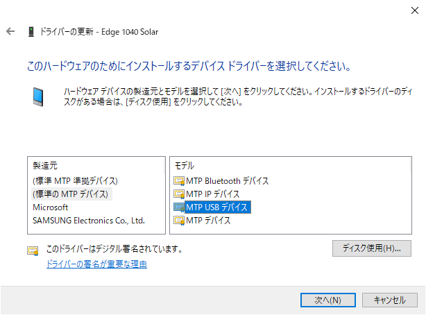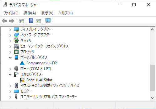 とはいえ、このままではどうしようもないので、物は試しと FR955 の設定を参考にしながら、MTP USB デバイスのドライバーを手動でインストールしてみると、あっけなく認識しました。