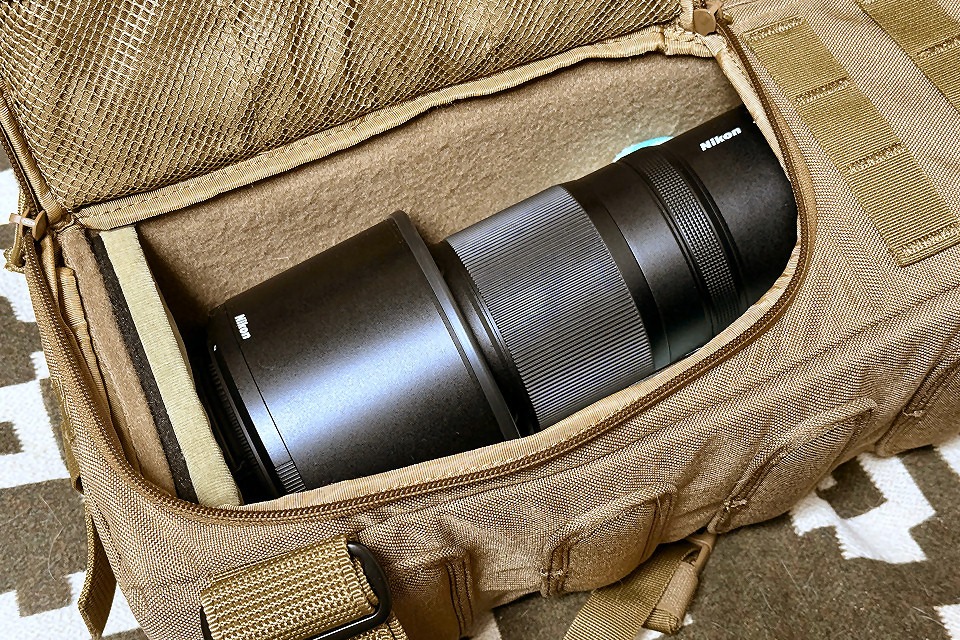NIKKOR Z 180-600mm だとピッタリ底まで使い切る感じで余裕なし。と言った訳で、このバッグ単体で双眼鏡も持ち運べるように、収納力アップ計画です。